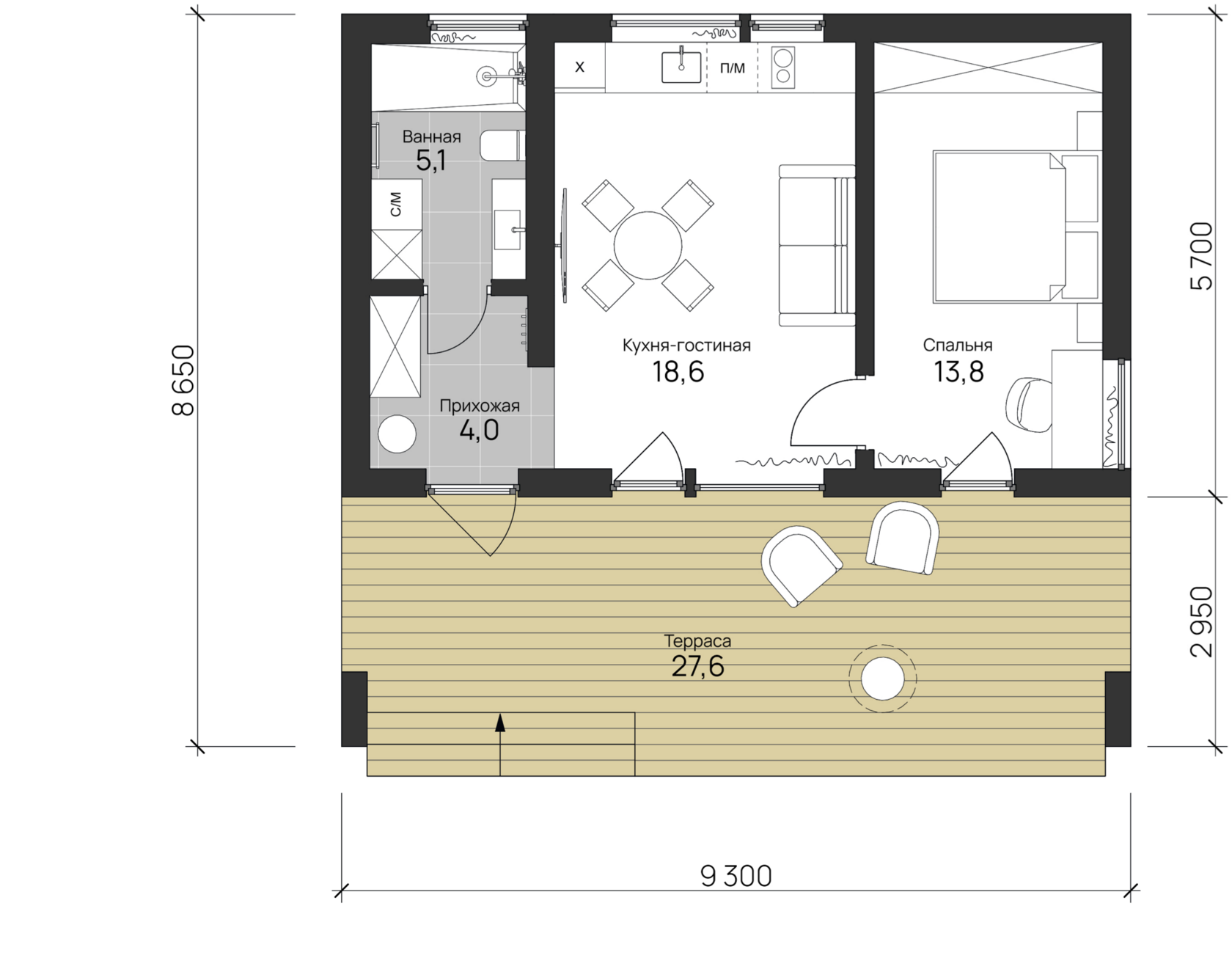 В спальне достаточно места для полноценной двуспальной кровати с тумбами и рабочего места. В ванной комнате рационально размещается всё необходимое, возможна установка ванны длиной 1,8м. На просторной террасе всегда готовы кресла для отдыха в жаркий полдень и мягкие пледы для вечернего чаепития.