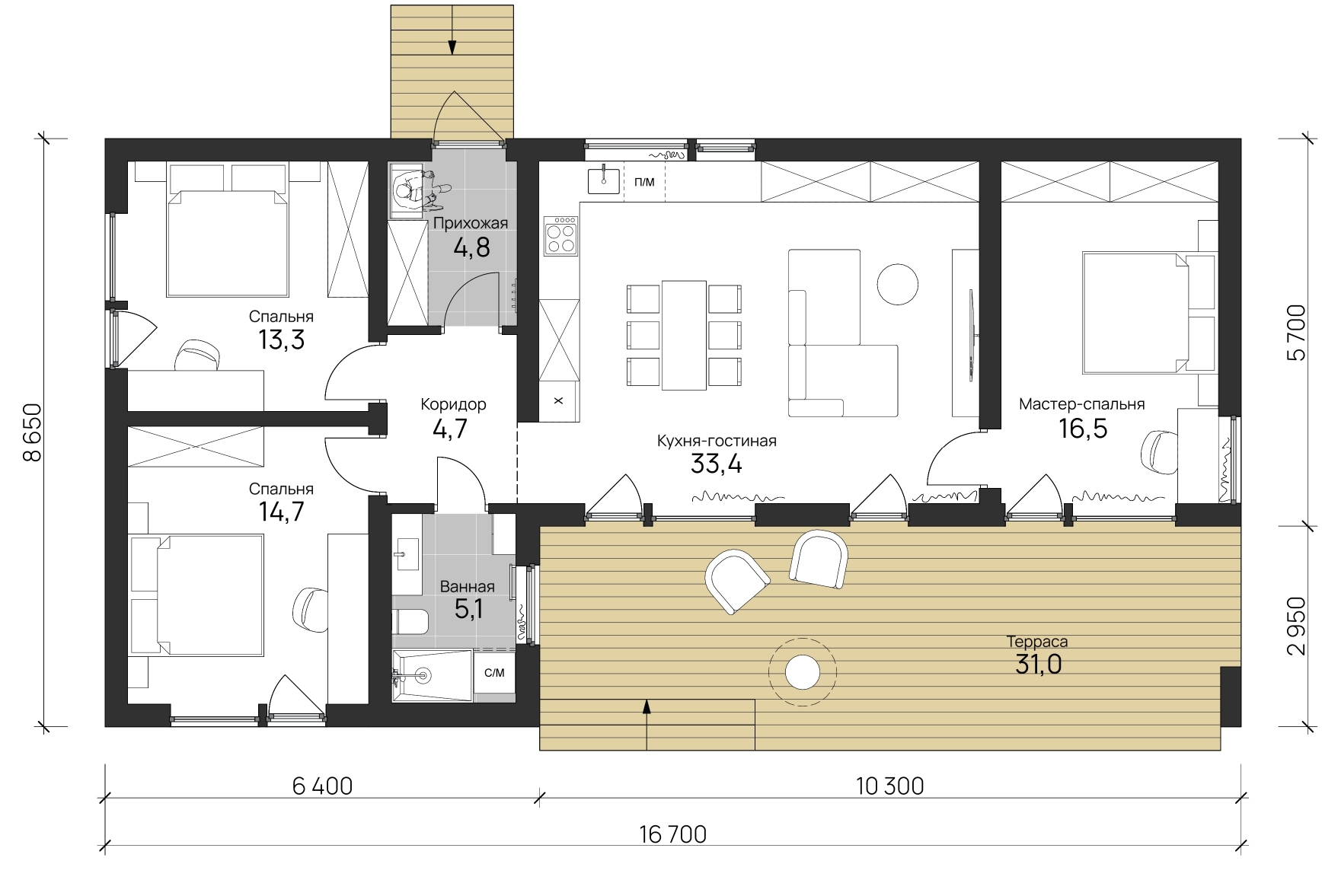 Большая терраса позволит реализовать все запросы семьи - станет местом семейных посиделок у камина, летней комнатой и зоной барбекю для компании друзей, зоной для игр детей и местом для романтичных посиделок после заката.
