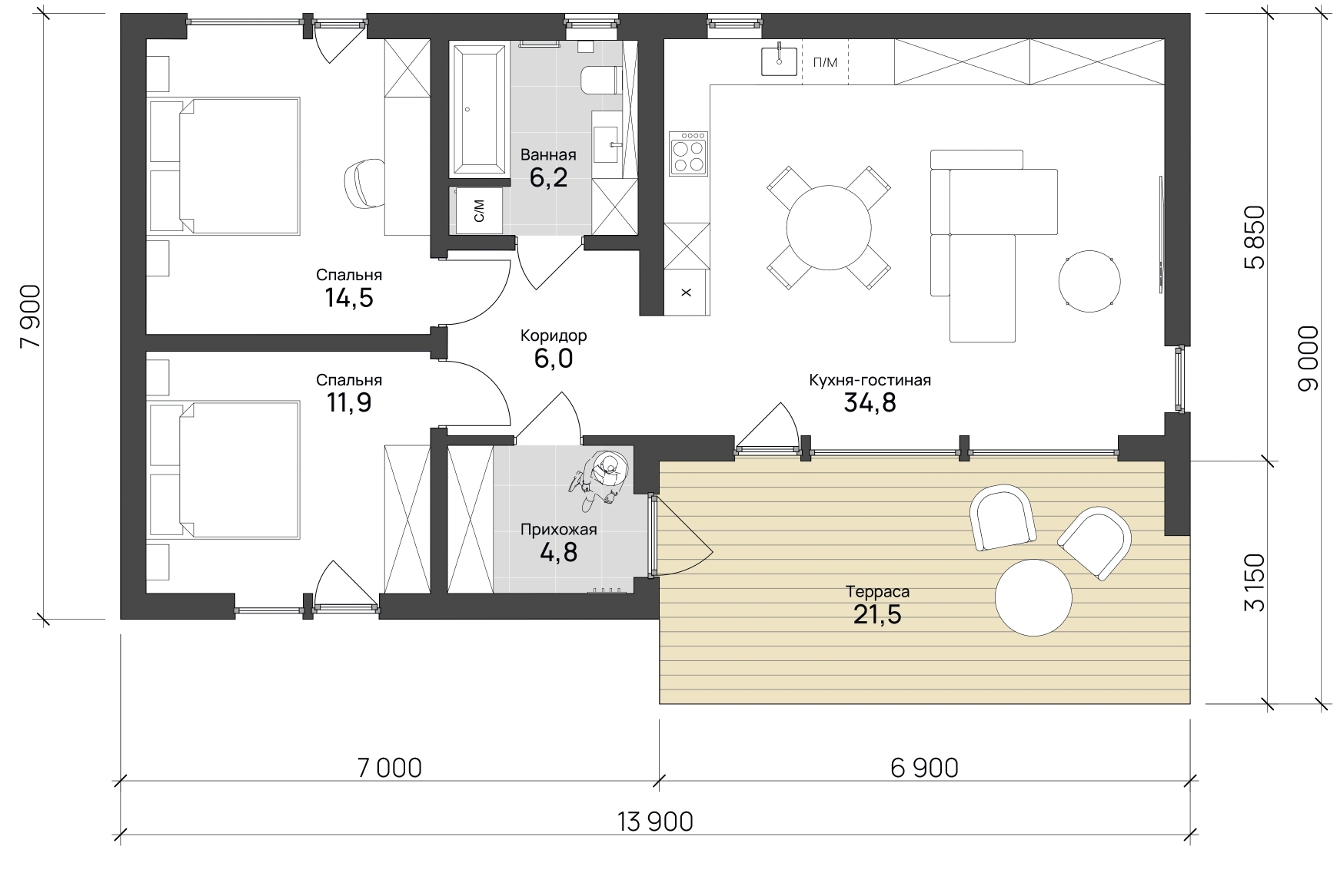 Цена дома включает подготовку проектной документации, изготовление и сборку комплекта на производстве, доставку, монтаж и отделку на участке. За внутренние коммуникации и чистовую отделку дополнительно платить не придётся – они входят в прописанную в договоре стоимость.